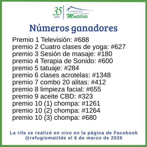 Queremos expresar nuestro profundo agradecimiento a todas las personas que nos apoyaron con la compra de boletos de nuestra rifa solidaria realizada durante el mes de marzo de 2026 para dar inicio al año de trabajo tanto en la Casa de Acogida como en el Centro de Atención Integral.